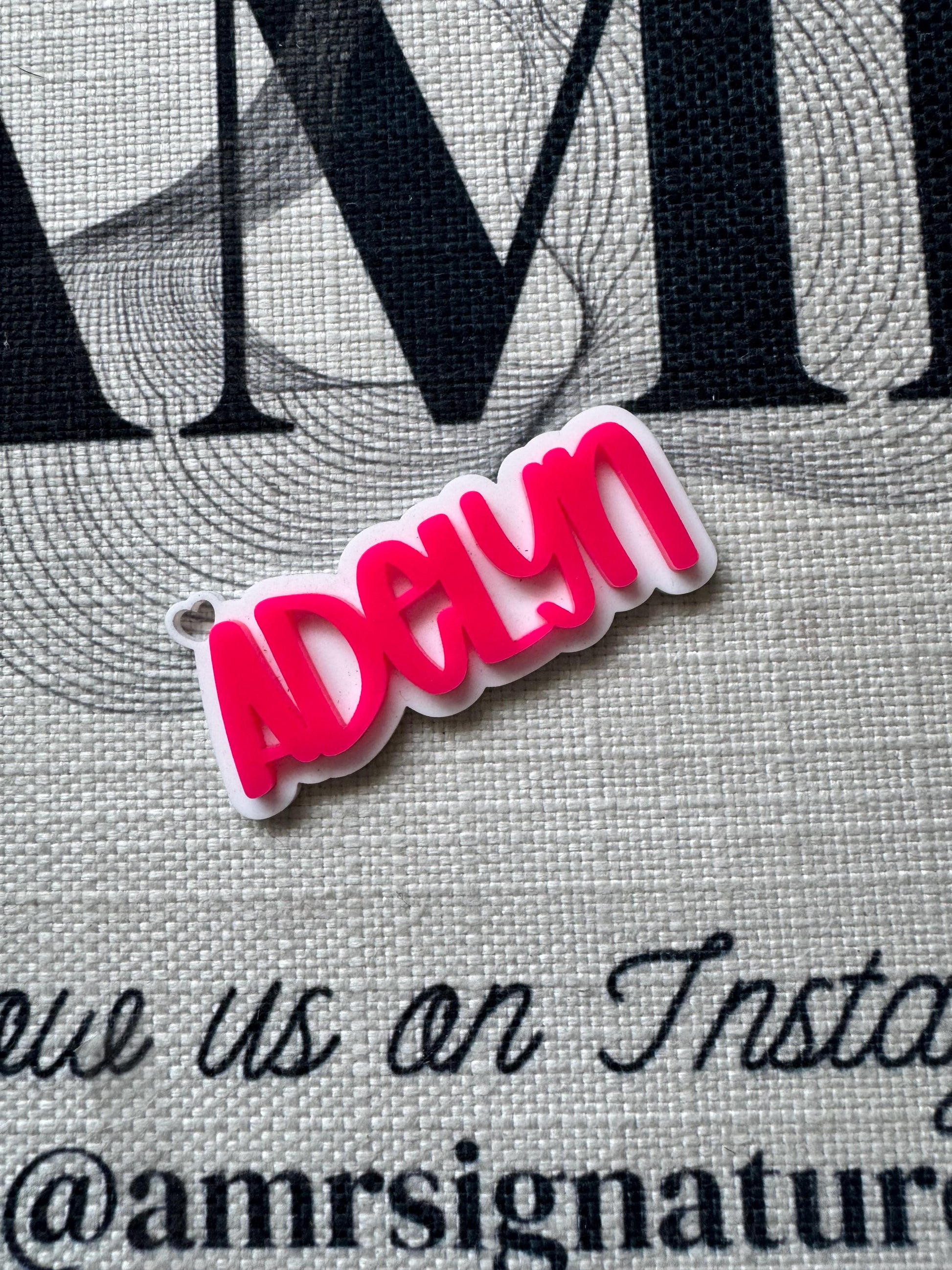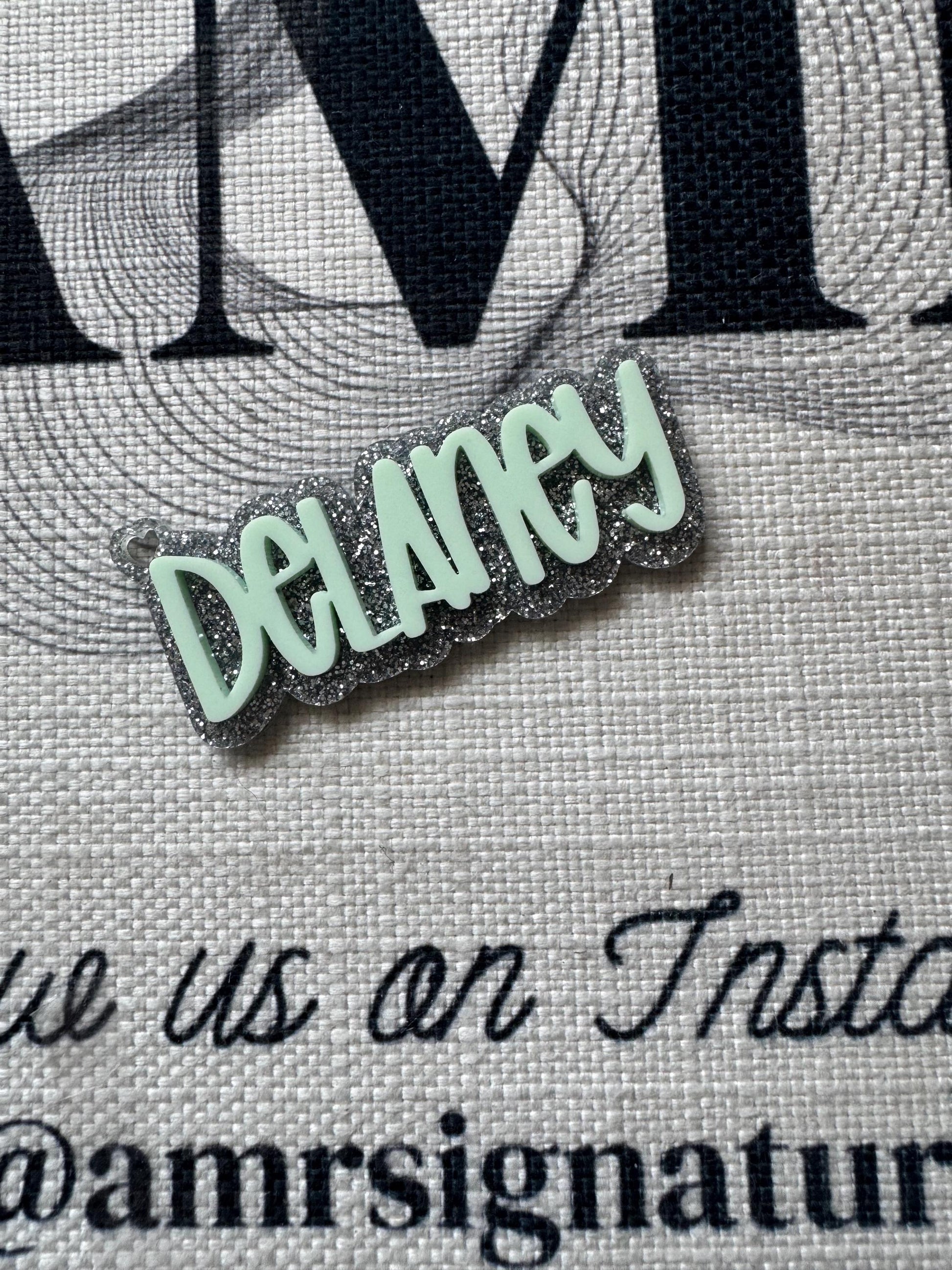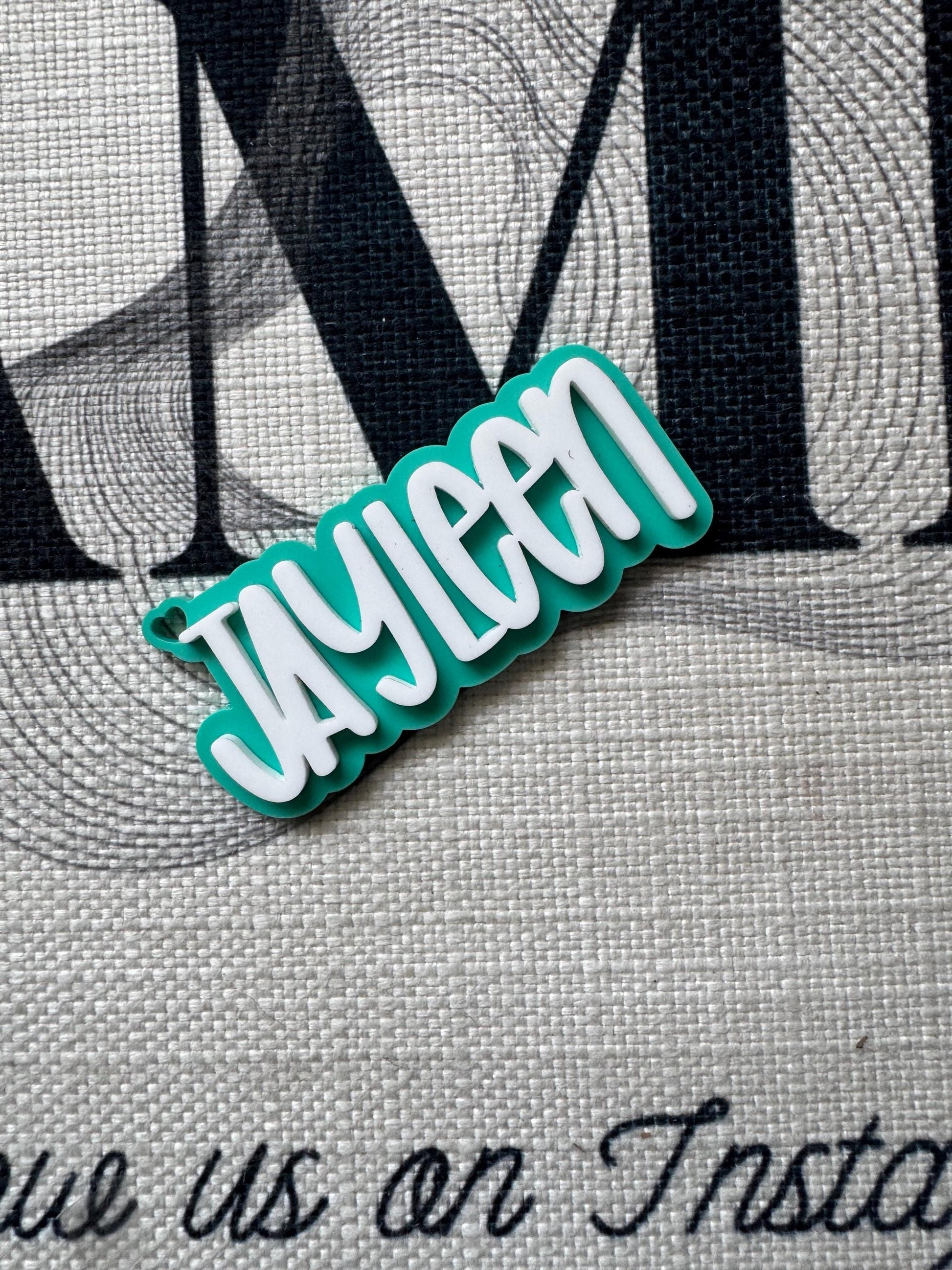 Personalized name keychain or backpack tag. Choose your favorite color and we’ll design it. Please keep in mind the height of the name will vary with each name depending on how long the name is. Most are made 3 inches in length. Any questions? Message us! Thank you!