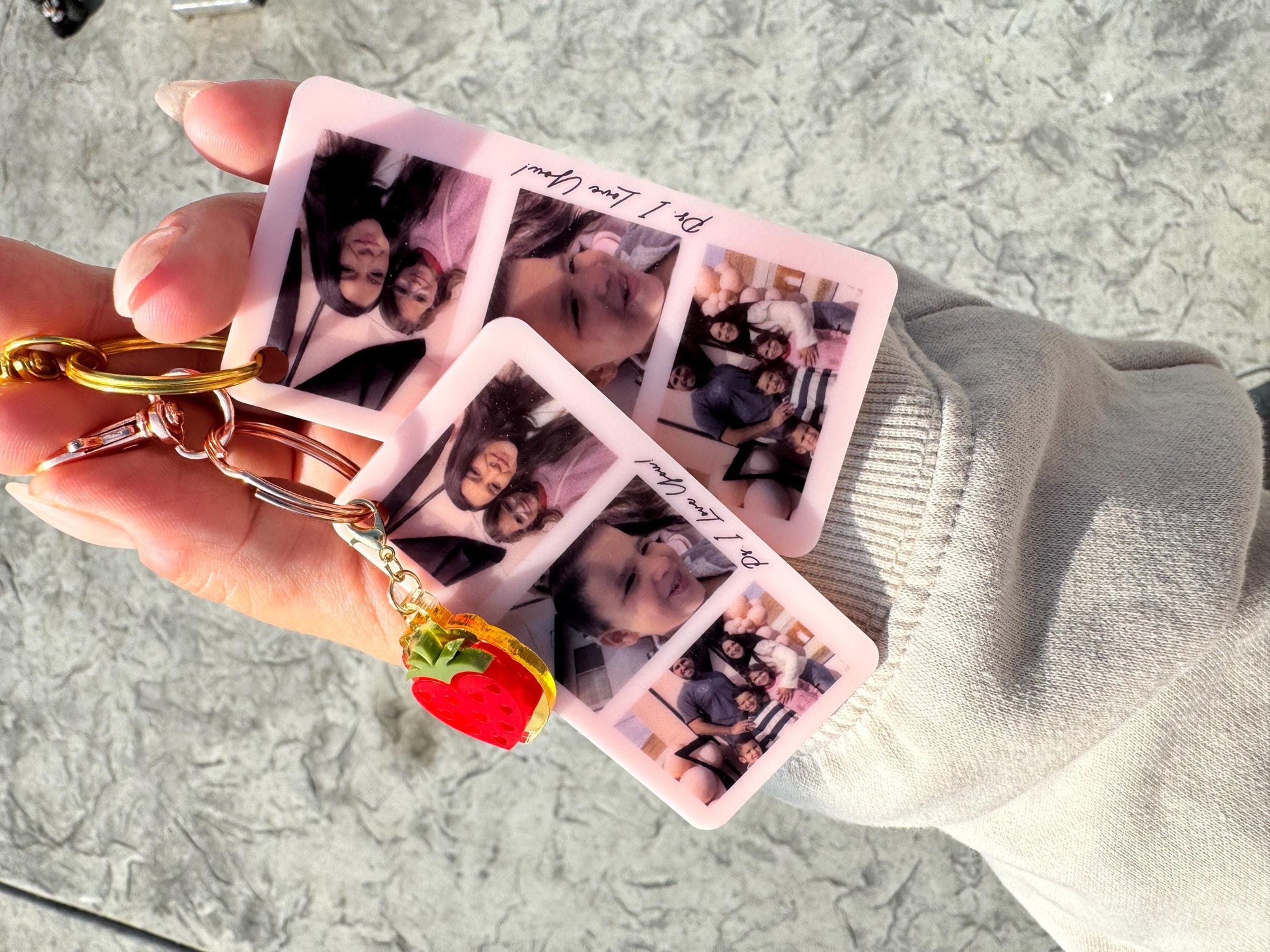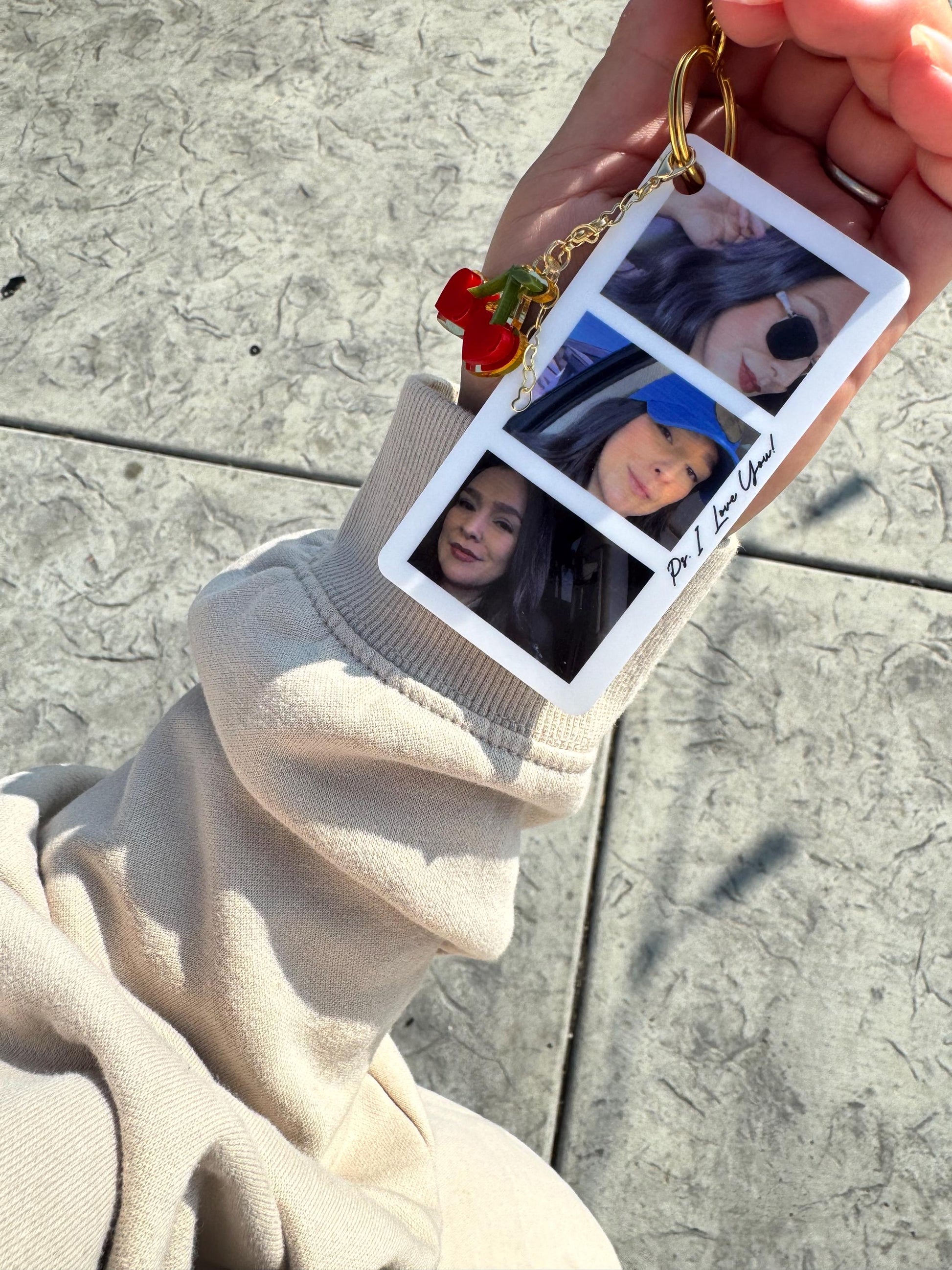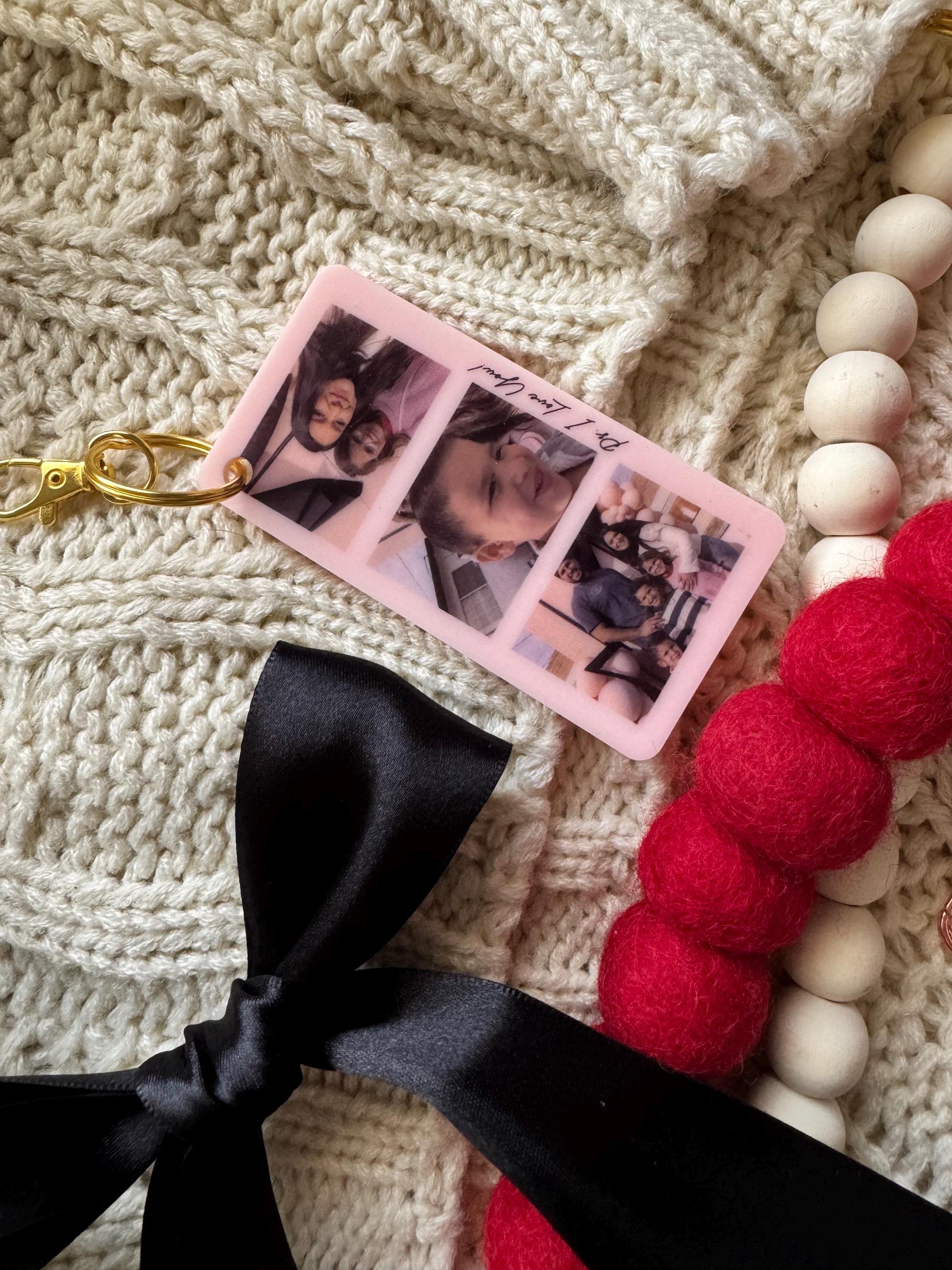 A keychain with your 3 favorite photos. The perfect gift for family, friends, couples, parents. Message on the side says “ps. I love you” if you would like something different or no message please specify when you email us your photos. Please email 3 non blurry/clear photos to amrdesignshop@yahoo.com