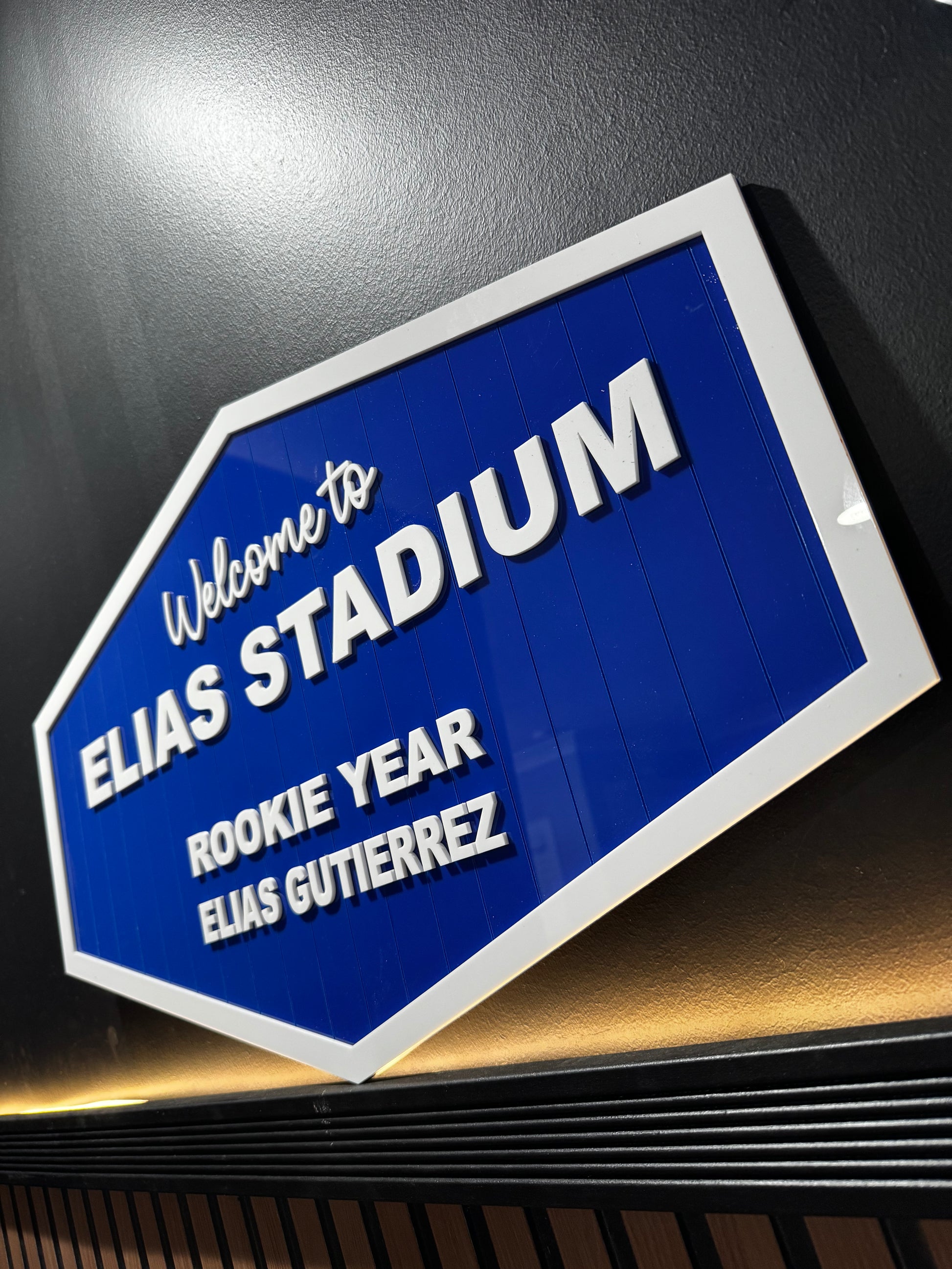 Blue Sports Themed Sign is perfect for nurseries or even birthday decor. Entire sign wording can be customized, please add to order notes at checkout. This sign measures 27.5x16.5 inches.