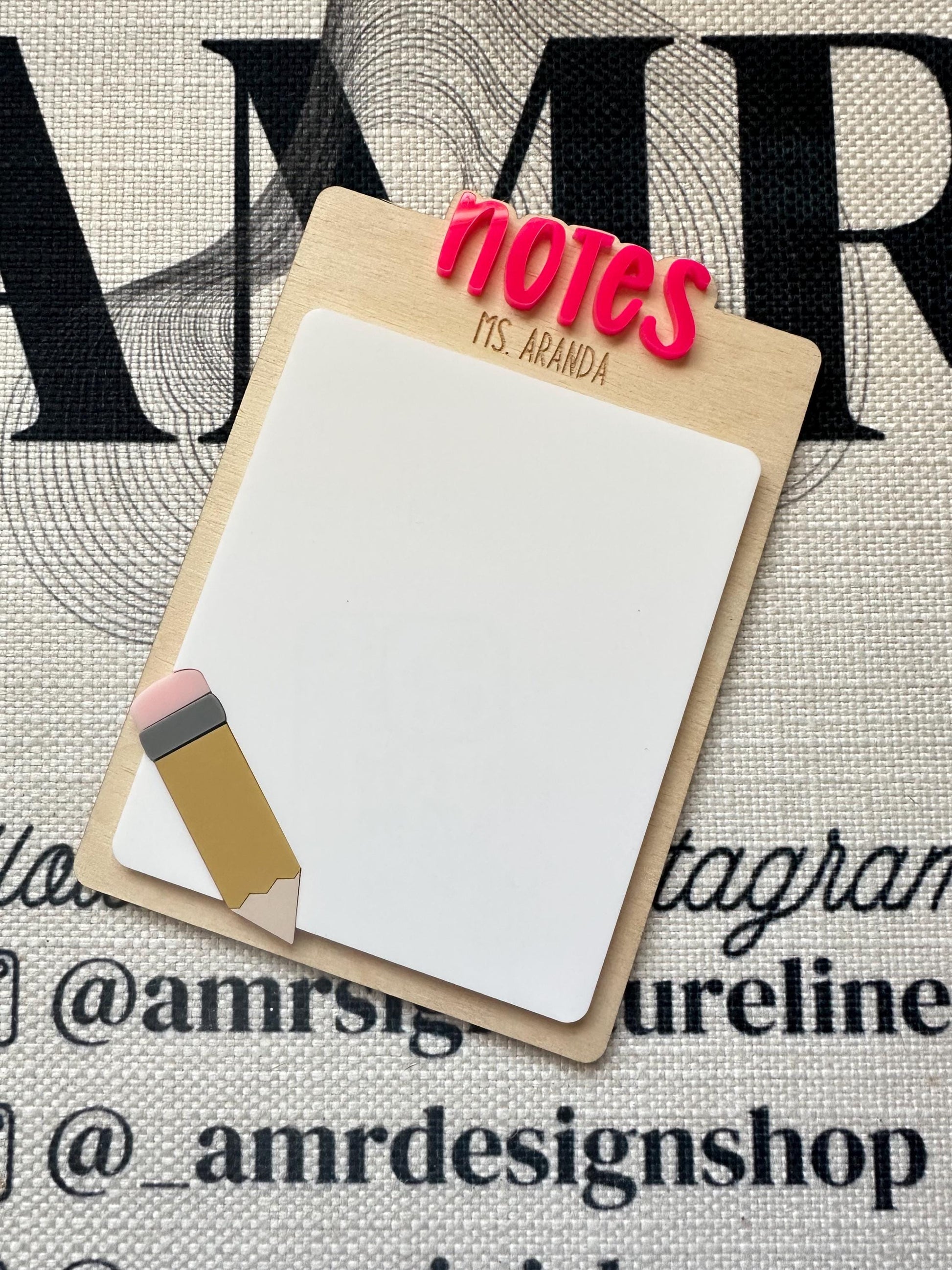 Dry Erase Note Taker for teachers. Can be used for yourself or gift to a teacher! Dry erase note pad measures 4x6 and can be customized to teachers name. Thank you for shopping with us!